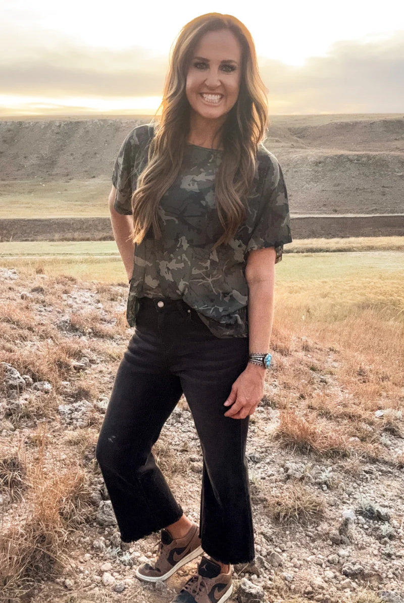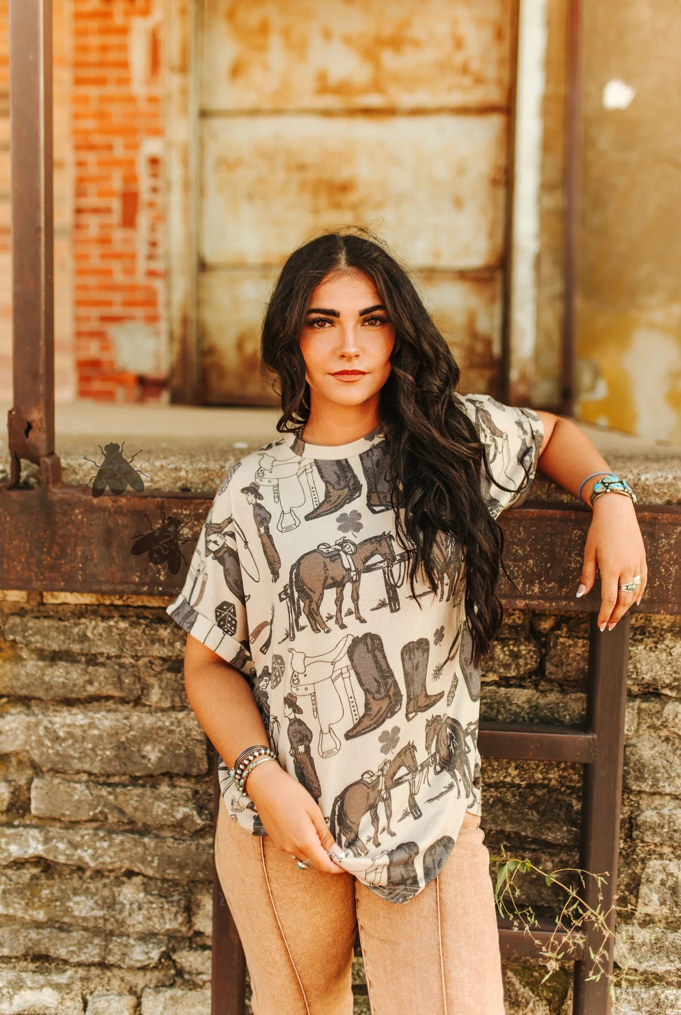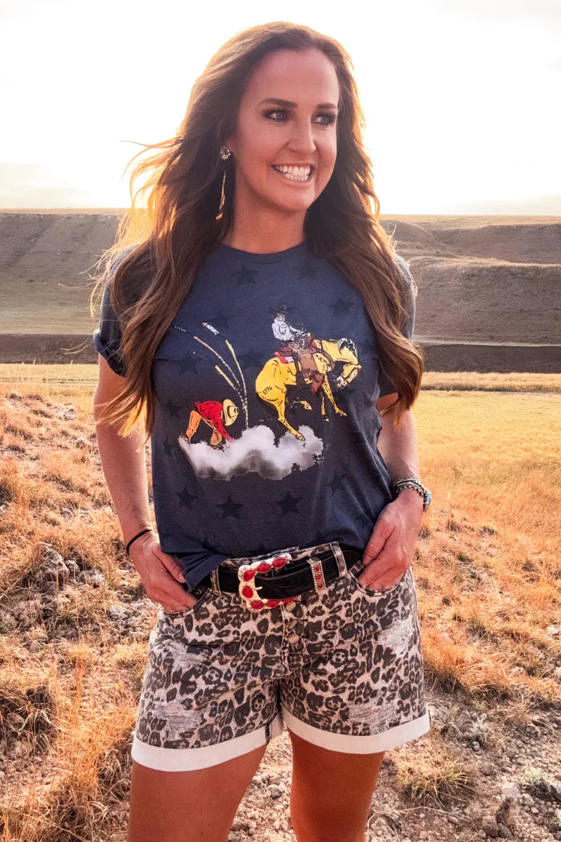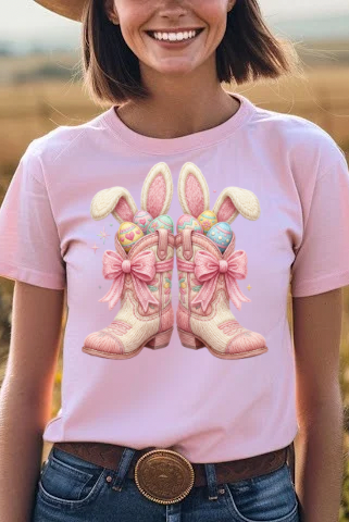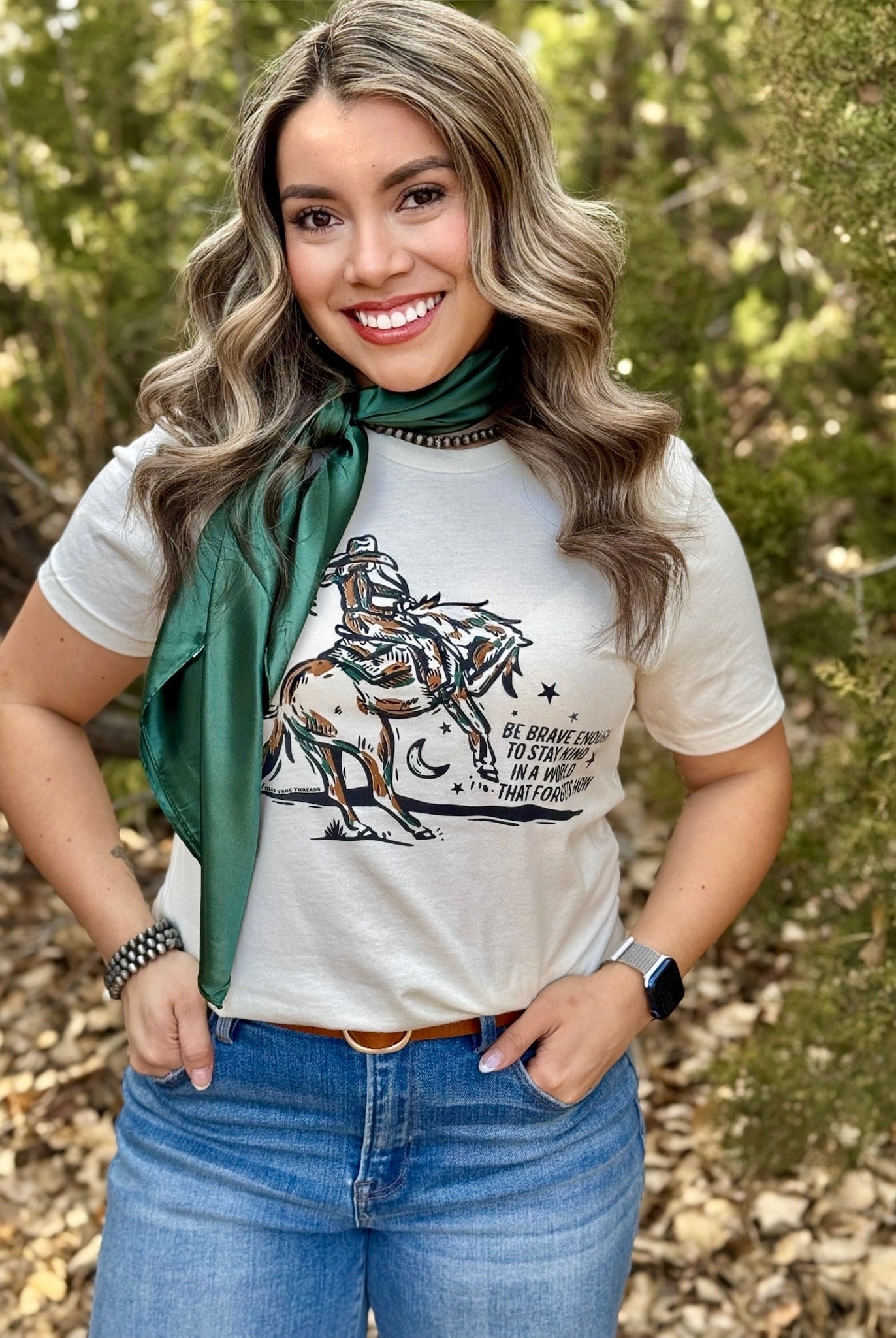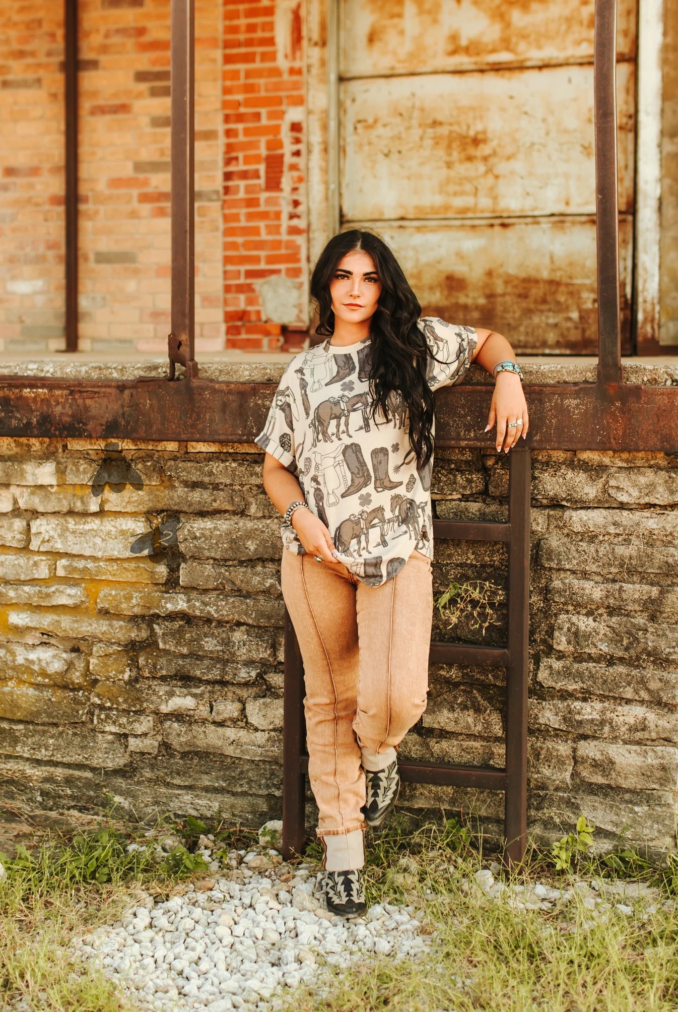 Our Just a Small Town Girl graphic tee features a beautiful Western-inspired design with a cowgirl silhouette, fluttering butterflies, and rustic details that capture that laid-back country spirit.