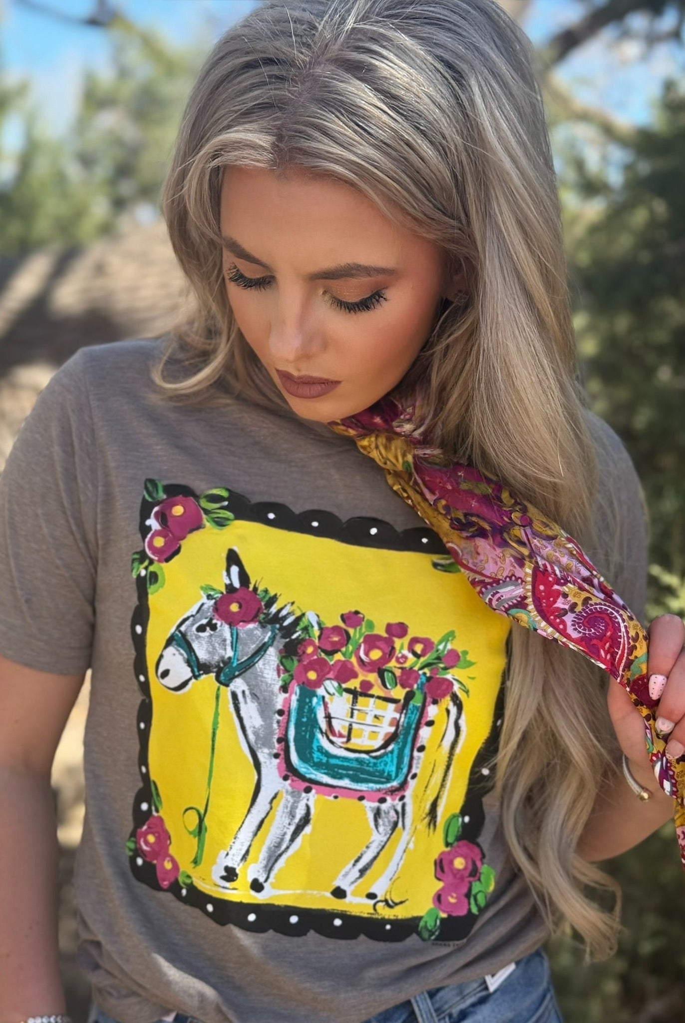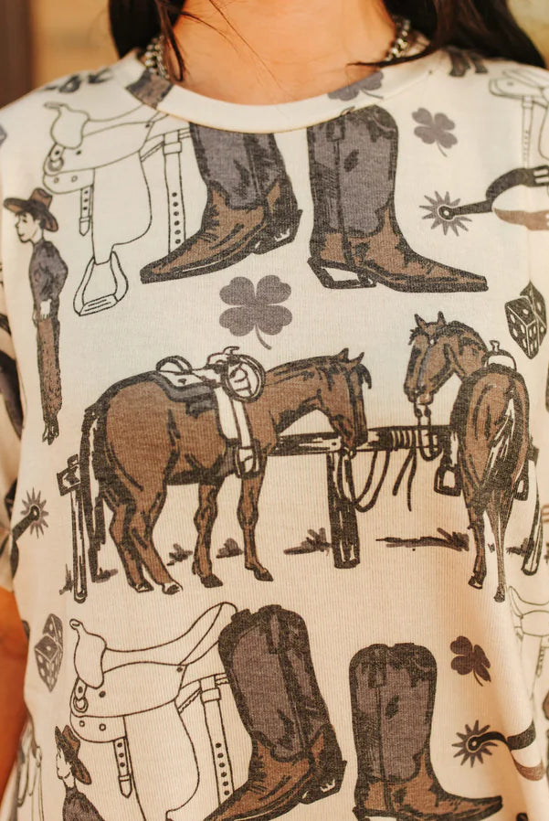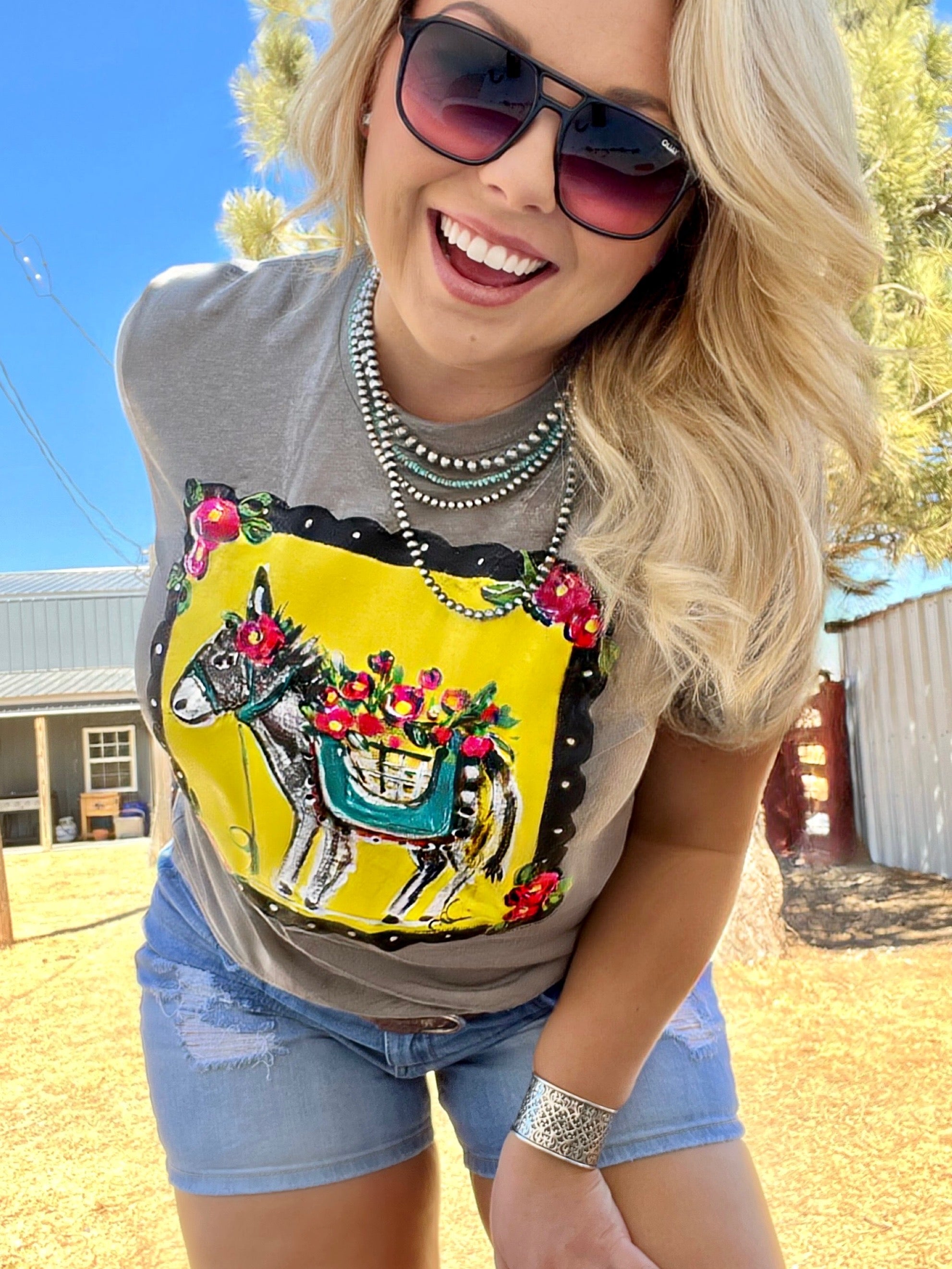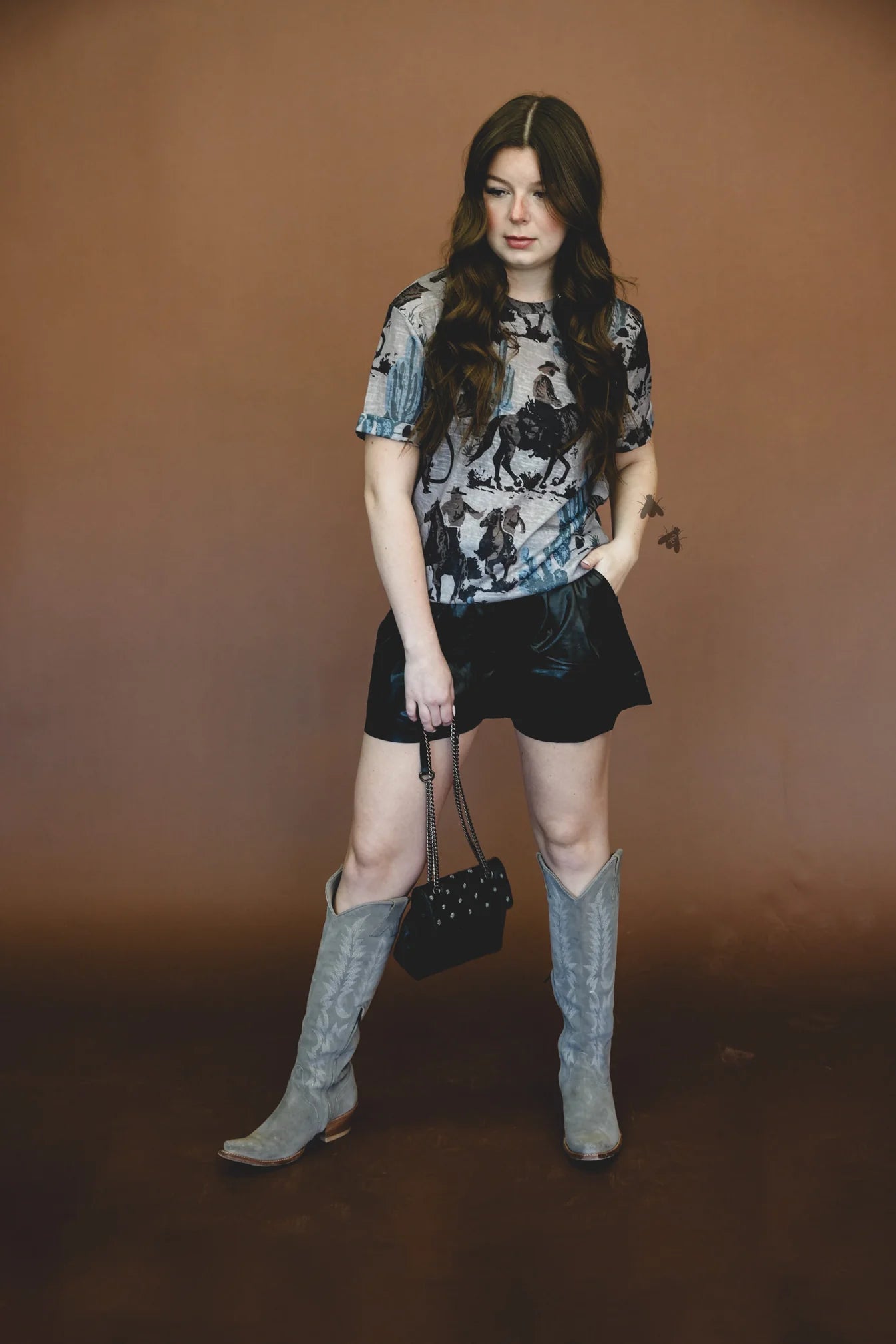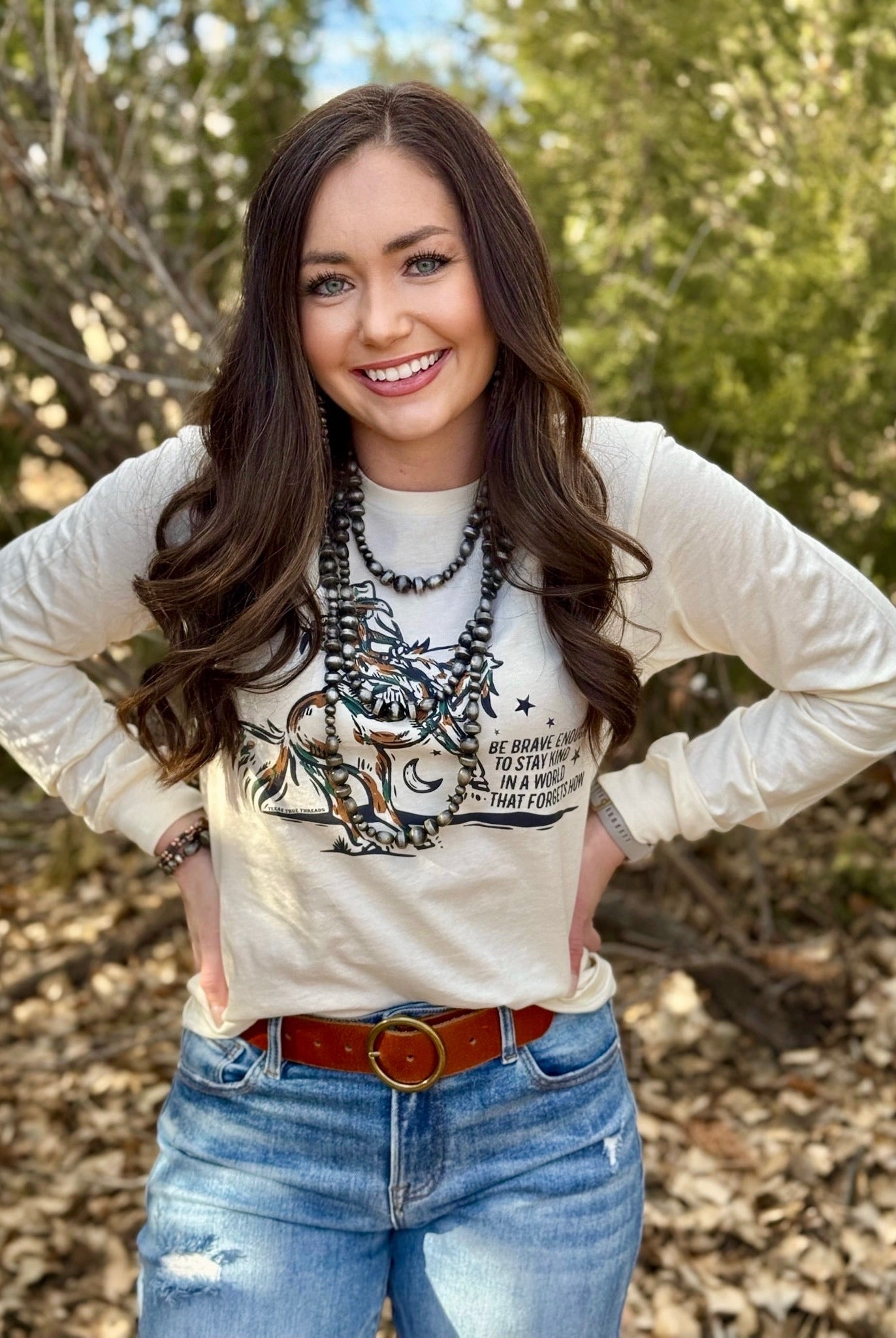 Our Just a Small Town Girl graphic tee features a beautiful Western-inspired design with a cowgirl silhouette, fluttering butterflies, and rustic details that capture that laid-back country spirit.