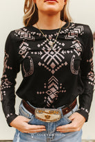 Make a bold statement this Fall with our Black Aztec Horseshoe Long Sleeve Top — a stunning fusion of Western charm and modern edge.. Crafted in a soft and stretchy performance knit fabric, it hugs the body for a flattering silhouette while offering supreme comfort for everyday wear. The full-length sleeves feature matching tribal-inspired patterns running down to the wrist, while the front and back present clean lines that make this a standout layering piece under shackets, denim vests, or fringe jackets.