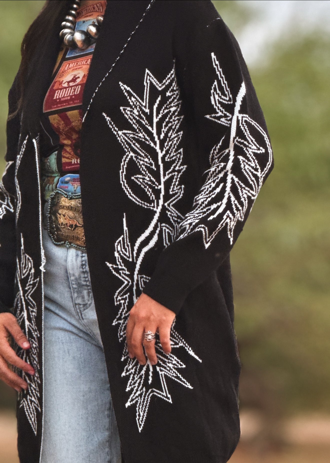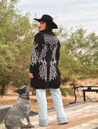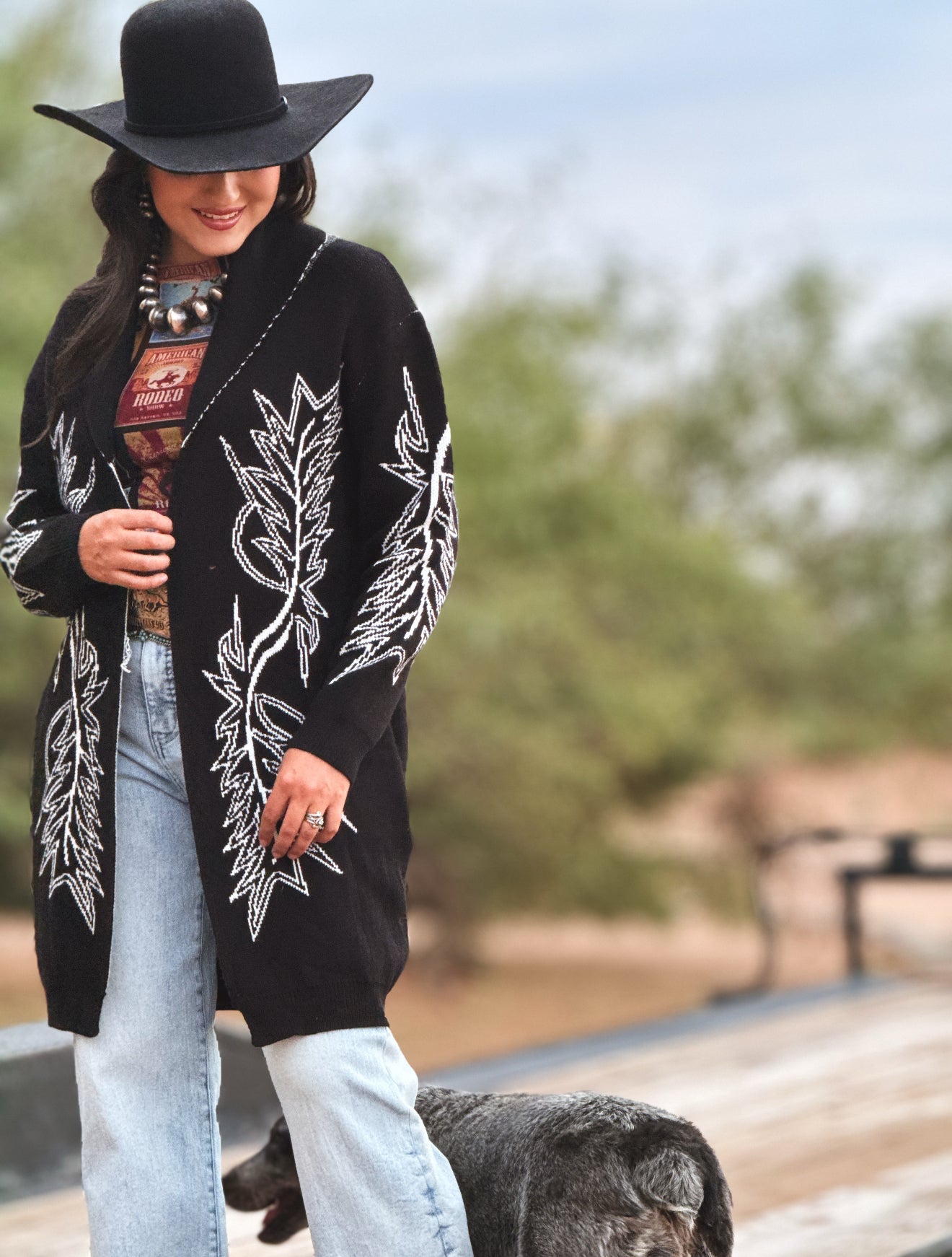 Wrap yourself in Western charm with our Black Boot Stitch Cardigan. This cozy open-front knit features bold white boot-stitch embroidery along the sleeves and sides, giving it that perfect cowgirl flair. The rich jade color makes it a standout piece while still pairing easily with your favorite denim, tees, or dresses.