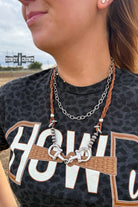 The Braided Bit Necklace blends western grit with boutique charm. Featuring a silver snaffle bit pendant, braided brown suede, and chunky chain links, it’s a bold statement piece that rides effortlessly from ranch days to nights out.
