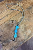 The Cowgirl Sky Necklace is all bright blues and wild-west charm. A long strand of silver beads leads into a trio of chunky turquoise stones, finished with a playful silver dangle for extra movement. It’s lightweight, eye-catching, and gives that perfect pop of rowdy color- like a little piece of open sky you can wear.