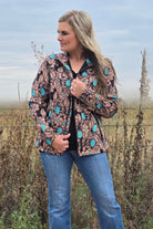 Elevate your outerwear with the Tattoos On This Town Jacket, featuring a unique tattoo-inspired tooled pattern that adds bold character to your look. Accented with vibrant pops of turquoise, this shell jacket blends edgy style with eye-catching color, making it perfect for standing out in any crowd. Durable and distinctive, it’s designed to keep you comfortable while showcasing your fearless fashion sense.