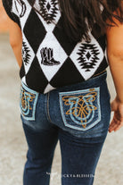 Turn heads in these Western-inspired dark wash jeans that were made to flatter and made to last. Featuring a mid-rise fit with a subtle flare leg, these jeans elongate your silhouette while staying comfortable for all-day wear. The standout detail? Boldly embroidered back pockets with turquoise and golden threadwork that bring a true cowgirl edge to your look. Finished with contrast stitching and classic five-pocket styling, they’re perfect for pairing with boots, heels, or your favorite graphic tee