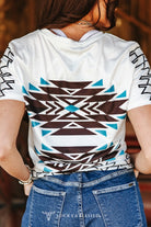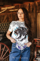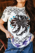 Elevate your ensemble with our distinguished women's graphic tee, where refined Western aesthetics meet contemporary design. The meticulously hand-drawn boots illustration, adorned with an elegant Aztec-inspired border in sophisticated turquoise, black, and purple tones, creates a statement of understated luxury. Crafted from premium soft fabric that drapes beautifully against the skin, this short-sleeve essential offers exceptional breathability for discerning comfort. The artful boot motif centered on pristine white fabric presents a curated balance of rustic heritage and polished style—perfect for the distinguished individual who appreciates Southwestern artistry with a touch of cosmopolitan flair.