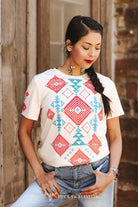 Elevate your wardrobe with this exquisite L&B short sleeve top. The sophisticated blend of ivory, coral, and turquoise creates a refined Aztec pattern that transitions effortlessly from casual to elegant settings. Crafted with attention to detail, this versatile piece pairs beautifully with your favorite accessories for a polished, distinctive look.