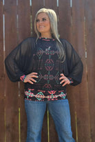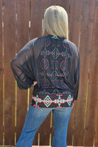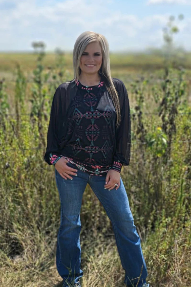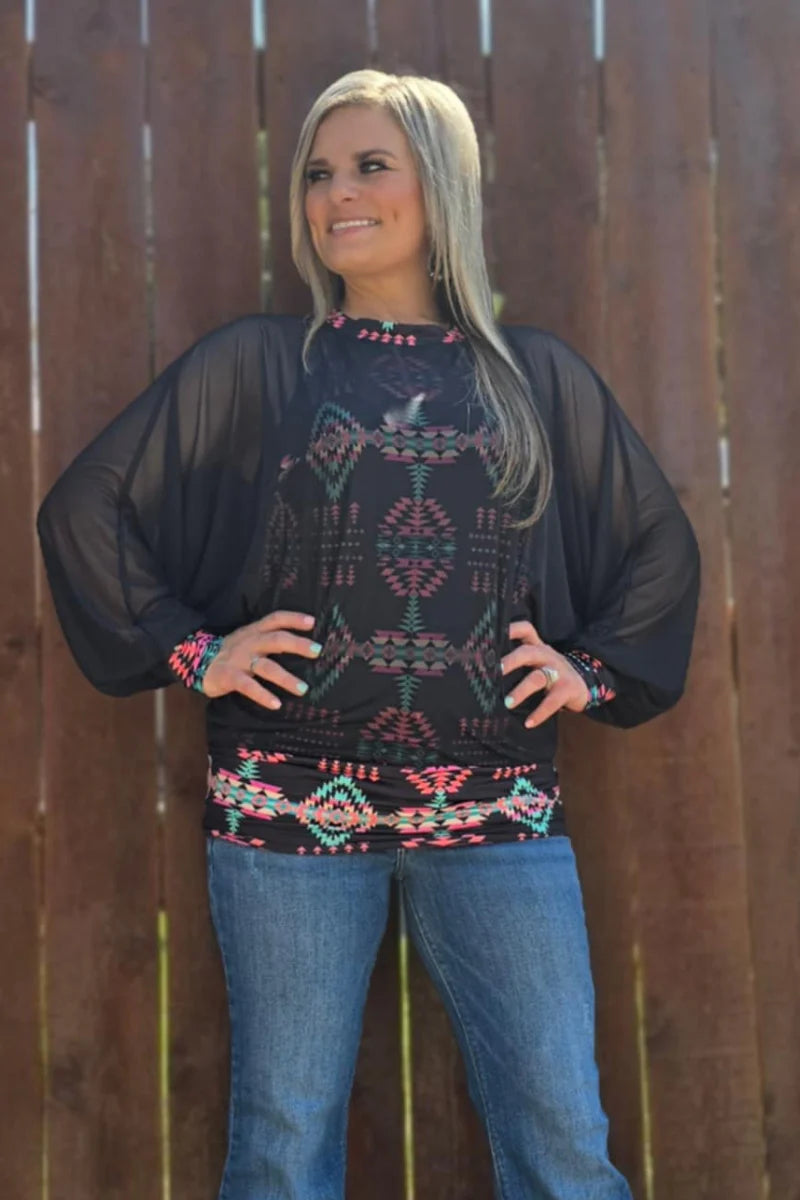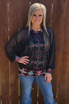 The Lucky To Have You Top is a stylish essential you’ll want to wear again and again. Its fitted black tank features a bright, colorful Aztec print that instantly brightens your look. Layered with a flowy mesh overlay and finished with a stretchy band at the bottom and matching cuffs on the sleeves, this top offers both comfort and flair. Elevate your wardrobe with a piece that effortlessly combines bold design and flattering fit.