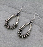 These earrings feature a stunning teardrop-shaped design composed of silver and gunmetal-colored Navajo-style beads. The beads alternate between highly polished, smooth rounds and slightly more textured, oxidized silver accents, creating a bold yet elegant contrast. They dangle from simple silver hooks, making them a versatile statement piece perfect for Western, Southwestern, or boho-inspired outfits. These earrings offer a modern take on classic squash blossom jewelry, ideal for adding a touch of rustic glam to any look.