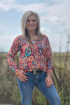 The Paisley On The Plains Top brings a timeless Western twist to a classic favorite. Featuring a bold paisley print, this long sleeve top was made for sunsets, rodeos, and everything in between. Lightweight & flattering, it pairs perfectly with your favorite denim and boots for an effortless look that’s as fierce as it is feminine. Whether you're two-steppin' under the stars or keeping it casual, this top rides with you in style. Pretty meets prairie — and it’s a total vibe.