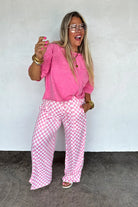 Cloud soft and so so stretchy! These  checker pants are the perfect way to add a "pop" to any outfit!! Features panel pockets, wide legs and elastic waist with faux drawstring. A slightly different style/fit than our original "bold block checker pants".