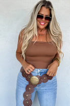 Statement western concho belt featuring oversized silver conchos with engraved detailing and a chain-style link. Adjustable fit with a hook closure. The perfect finishing touch to dresses, jeans, or jumpsuits — adds instant cowgirl glam to any look.