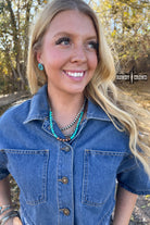 Meet your new everyday road-buddy. The Ramblin’ Necklace mixes vibrant turquoise beads with warm bronzed accents for a look that’s laid-back but still full of western soul. Easy to layer, easy to love-  it’s the perfect pop of color for any outfit that’s ready to roam.