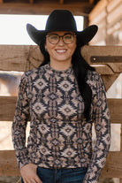 The Smoky Mesa Top blends comfort and style with its eye-catching tan and cream Aztec design. Crafted for a perfect fit, this long sleeve top brings warmth and a touch of Southwestern flair to your wardrobe. Ideal for layering or wearing solo, it effortlessly elevates casual looks while keeping you cozy throughout the day. Embrace a unique pattern that adds character and versatility to any outfit.