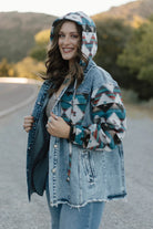 Embrace effortless style with the Southern Roots Denim Shacket, featuring a striking Aztec print on the sleeves, hood, and pockets for a distinctive look. Crafted from durable denim, this shacket offers both comfort and rugged charm. The detachable hood adds versatile wear options, allowing you to adapt to changing weather while maintaining a fashionable edge. Perfect for layering, it blends classic denim toughness with bold, authentic patterns for standout casual wear. Elevate your wardrobe with this unique piece that balances tradition and trend seamlessly.