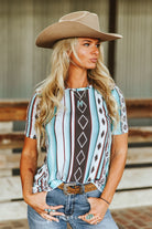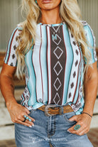 This top is giving serious Southwestern sass with a bold Aztec-inspired print! It features vertical turquoise, brown, and white stripes with diamond and arrowhead motifs running down the front and sides. The contrasting patterns create a slimming and elongating effect, while the short sleeves and crew neckline keep it comfy and casual. Styled here with a statement belt, turquoise rings, and a wide-brimmed cowboy hat, this tee is perfect for rodeo nights, country concerts, or just showing off your wild Western roots. 💎🤠🌵