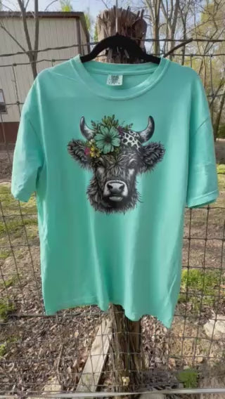 Snuggle up with the cute cow highlander on our Spring tee, complete with beautiful flowers. Perfect for embracing the new season and adding a touch of charm to your wardrobe. Get ready to bloom with this must-have for spring!