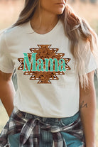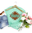 "Add a touch of bohemian elegance to your wardrobe with our Tooled Aztec Mama tee. The intricate leather-look Aztec design is perfect for the fashionable mama. Make a statement and show off your unique style with this must-have tee. Order now and elevate your everyday look!"