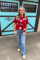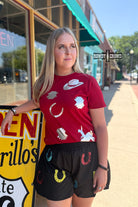 Get ready for the PERFECT summer concert tee. The Troubadour Tee is covered in metallic western prints on a solid cherry red tee. Its soft, lightweight and will easily keep you cool all summer long. Pair it with shorts, jeans and even leggings, its versatility leads to endless outfit possibilities.