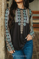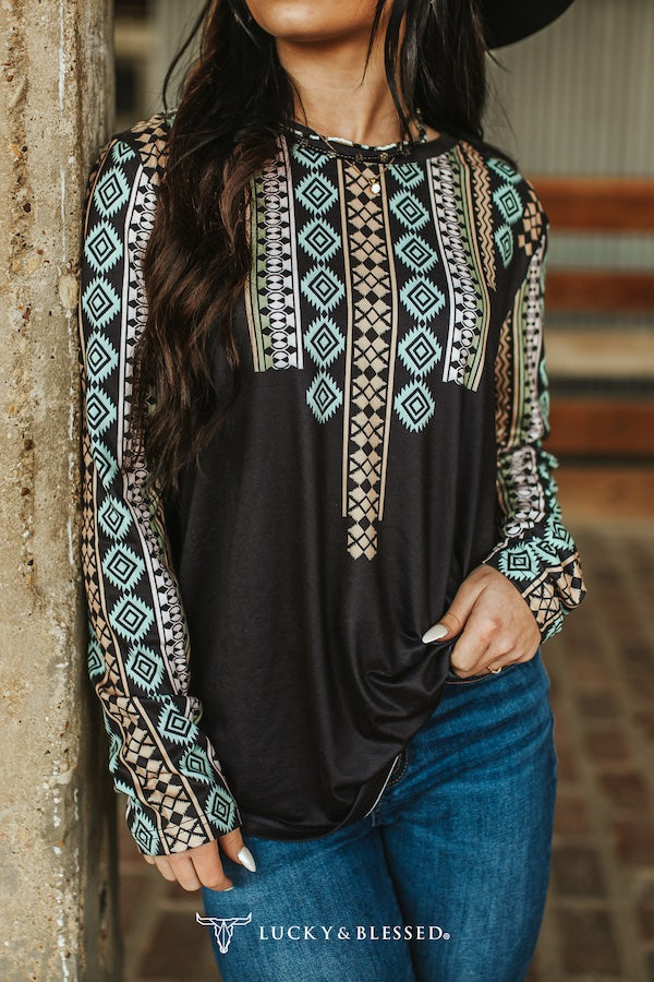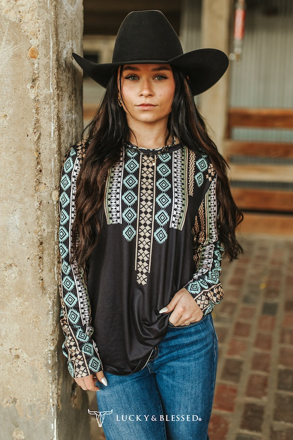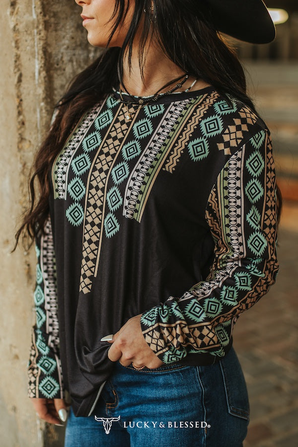 Make a bold statement with the Turquoise Trails long sleeve top! This eye-catching piece features a black base with stunning Southwestern-inspired geometric patterns in shades of turquoise, beige, and soft olive. The detailed print runs along the sleeves and down the front for a flattering, elongated look.