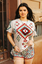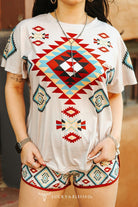 Step into bold Western fashion with this stunning Aztec printed matching set, perfect for women who love a mix of comfort, flair, and culture. Featuring a soft beige base with vivid red, turquoise, and black Aztec motifs, the top boasts a relaxed fit and short sleeves for a breathable and stylish silhouette. Paired with coordinating elastic-waist shorts adorned in the same tribal pattern, this set is ideal for rodeos, festivals, or a statement everyday outfit. Made for movement and crafted for style, it blends Southwestern heritage with modern western charm—an eye-catching wholesale favorite for retailers stocking Western women’s fashion.