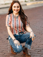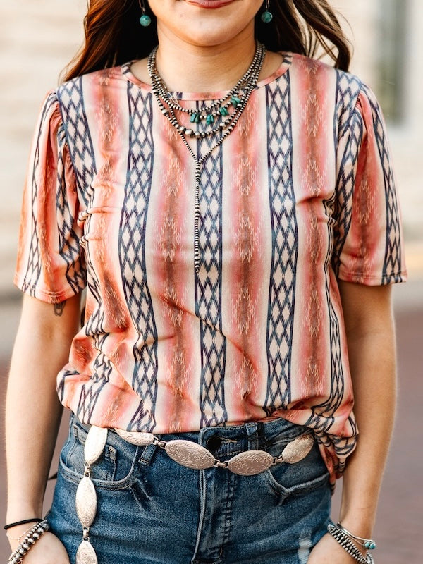 This top features a soft, Southwestern-inspired design with vertical stripes in warm tones of peach, coral, and cream, accented by navy geometric patterns. It has a relaxed fit with short sleeves and subtle ruching along the shoulders, adding a touch of feminine detail. The lightweight fabric makes it perfect for all-day wear, and it pairs beautifully with denim and Western accessories for a chic, country-inspired look.Material: 95%poly 5% spandex
