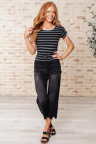 Add some fun to your wardrobe with the Vaguely Speaking Striped Top. This ribbed knit top features a round neckline and form-fitting silhouette, with a functional drawstring sleeve (perfect for adjusting to your desired length). Show off your style with this playful top.