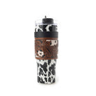 Elevate your daily beverage experience with our Wide Wyoming Tumbler, featuring a striking cowhide print and a rich tooled leather cuff and handle in chocolate brown. Crafted from durable thermostat steel, this tumbler combines rustic Western charm with practical design. Its ergonomic handle and spill-resistant lid ensure effortless style and convenience whether at home or on the move.