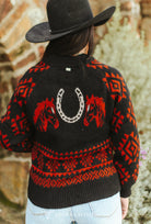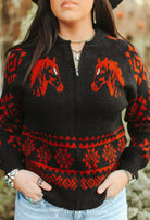 Saddle up in cozy cowgirl style with this bold Western knit! This zip-up sweater features striking red horse heads on the front and a lucky horseshoe design across the back — the perfect mix of rustic charm and rodeo sass. The black base with rich red Aztec patterns gives it that classic ranch-ready vibe that pairs perfectly with denim and turquoise.
