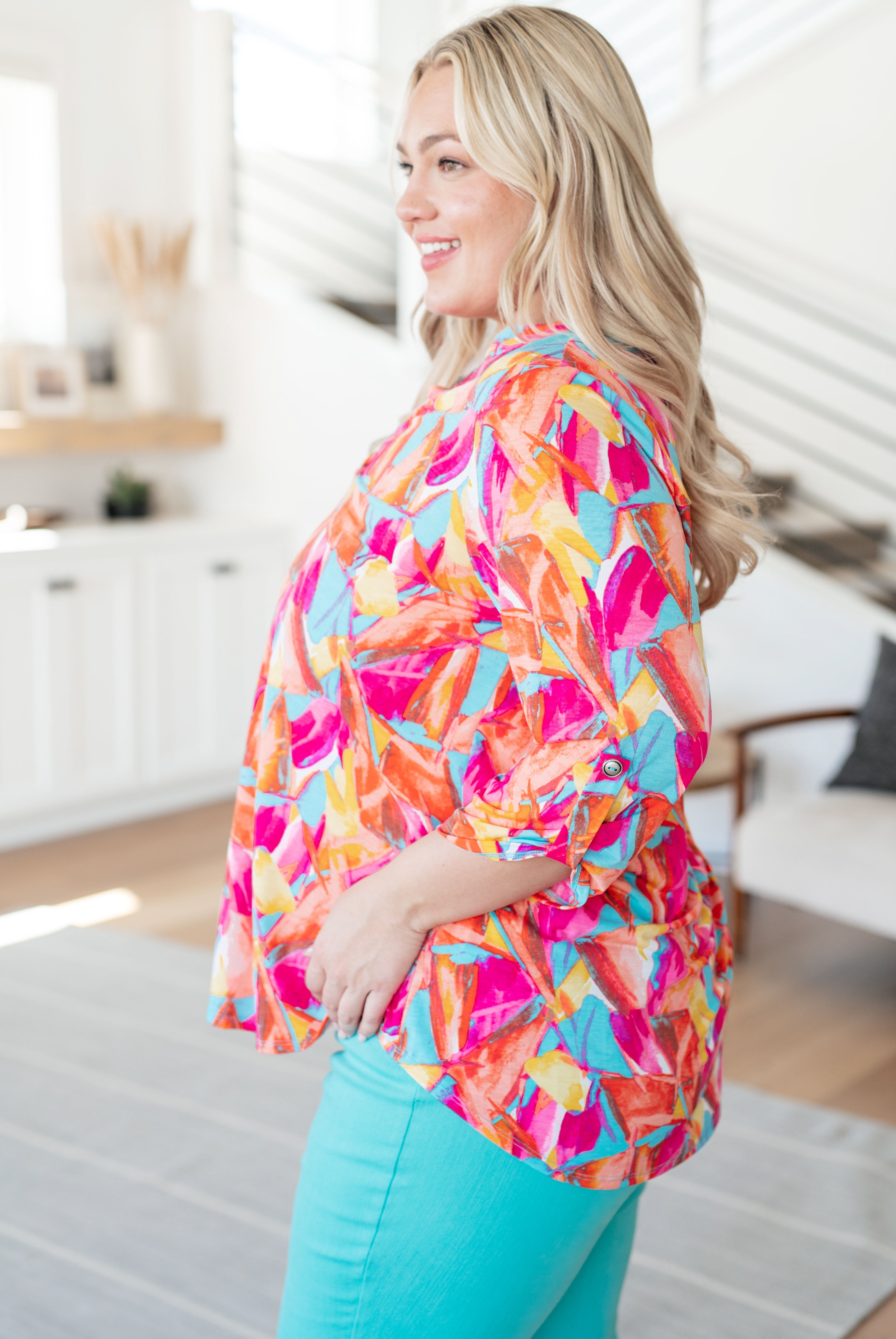 Lizzy Top in Teal and Hot Pink Abstract Fans