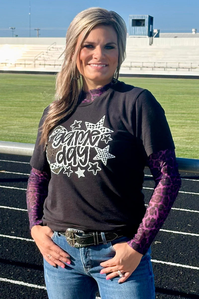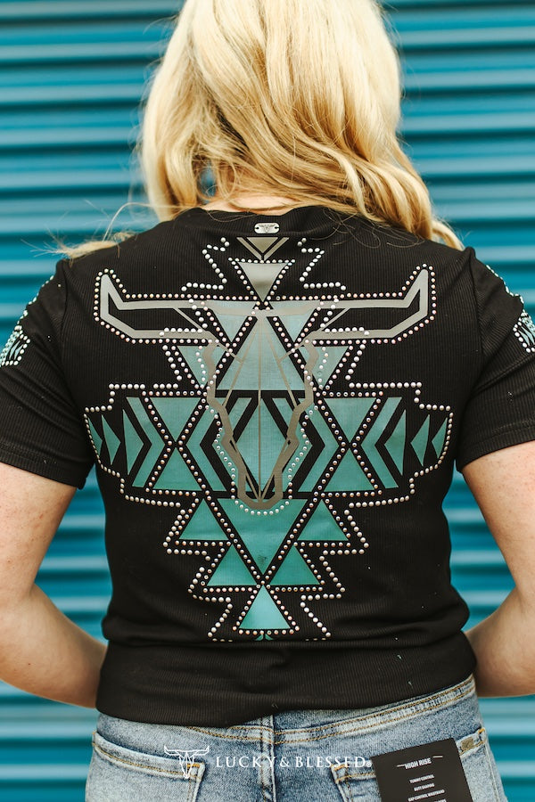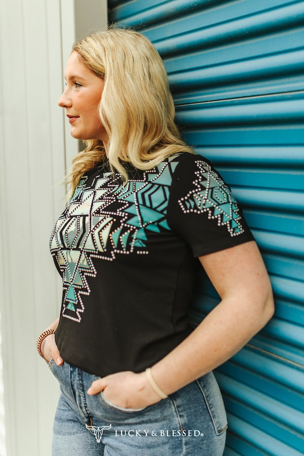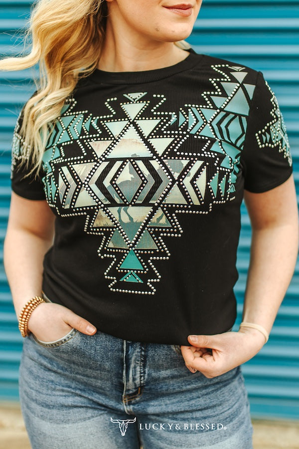 Black Ombre Aztec Rhinestone/Studded Short Sleeve Top