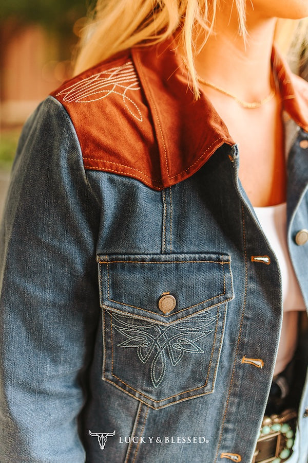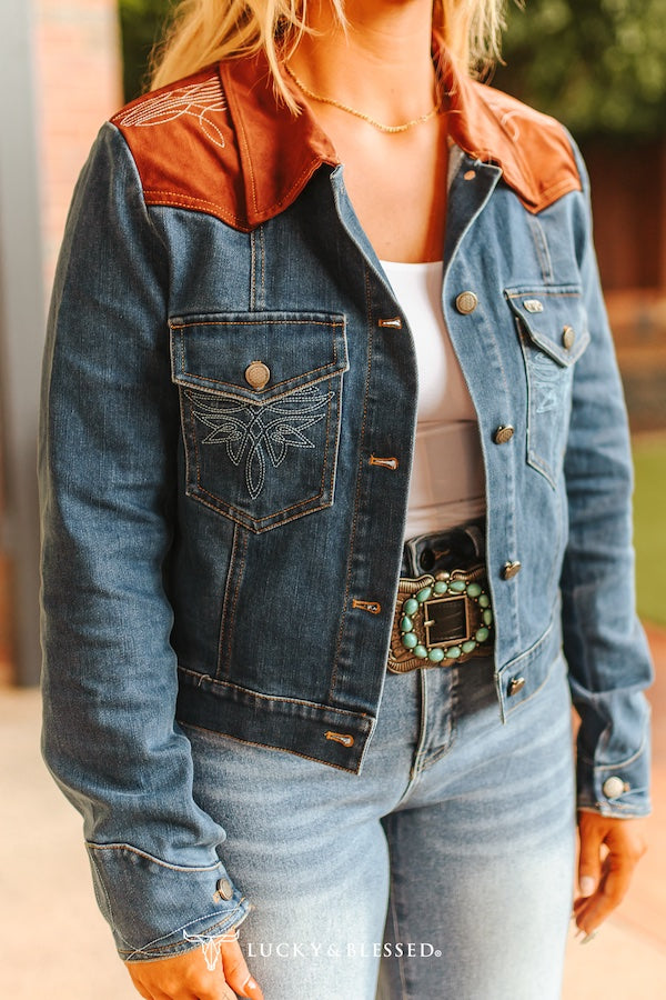 Denim Embroidered Boot Stitch Detail Brown Leather Yoke Jacket