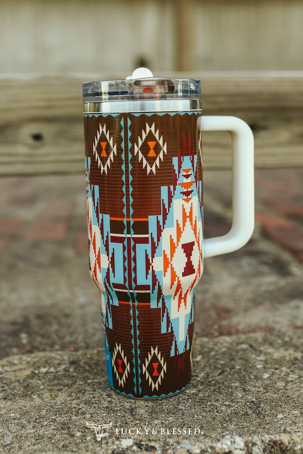 Brown Cream Aztec Printed Flip Straw Tumbler (40oz)