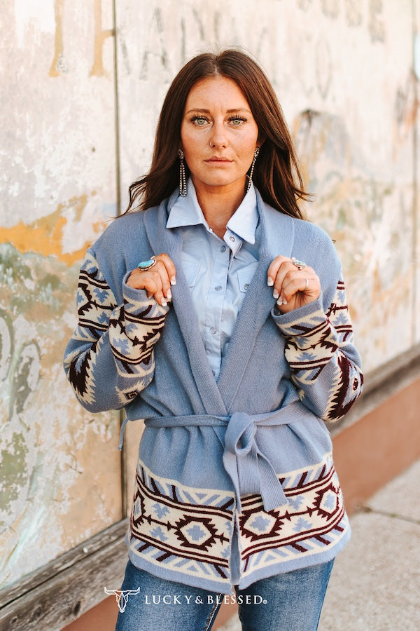 Blue Grey Aztec Knit Sweater Cardigan With Side Pockets