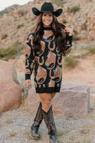 The Ruidoso Sweater Dress adds a playful twist to cozy fashion with its delightful horses and horseshoes design. Soft and comfortable, this dress is perfect for those who want to showcase their equestrian spirit while staying warm. Whether for casual outings or relaxed days at home, it brings a fun and charming vibe to your wardrobe.