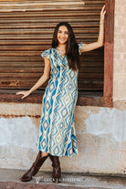 Channel timeless western sophistication with this Aztec Printed Ruffle Hem Maxi Dress. Showcasing a striking geometric Aztec pattern, it features a flattering v-neckline, delicate flutter sleeves, and a flowing ruffle hem that enhances graceful movement. Crafted from soft, breathable fabric, it offers comfort throughout the day, ideal for summer festivals or western-inspired events. Complete your ensemble with boots and turquoise accents for an elegant, authentic cowgirl statement.