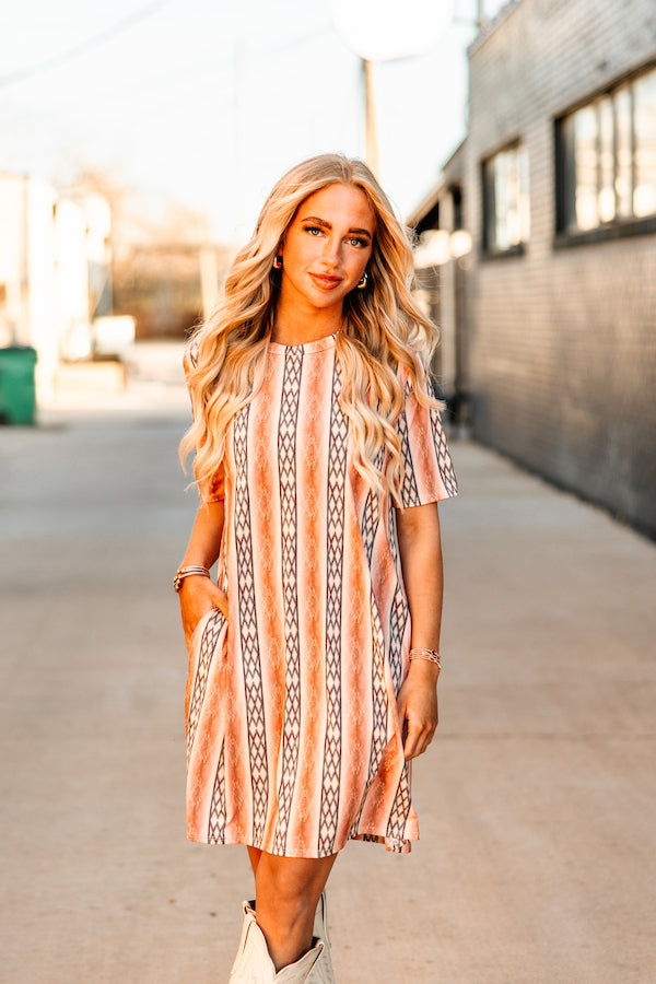 This dress is a stylish and effortless Western-inspired piece featuring a soft, flowy silhouette with a relaxed fit. It showcases a vertical striped pattern in warm tones of peach, coral, and cream, accented with navy geometric designs for a subtle Southwestern touch. The short sleeves and lightweight fabric make it perfect for warm weather, while the knee-length cut provides a flattering and comfortable look. Paired with cowgirl boots and minimal accessories, this dress is a go-to for casual outings, rodeos, or country-inspired fashion statements!