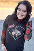 Rock a bold statement with this black tee featuring a striking cowboy-on-bronc design at its heart. The centered graphic showcases a rugged rider in camo chaps, framed by an intricate camo chain forming a perfect heart shape. Delicate roses bloom around the border, blending wild western vibes with romantic flair. It's the perfect mix of tough and tender—ideal for anyone who loves their country style with a touch of attitude.