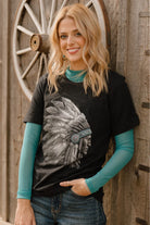 Rock this edgy black tee that showcases a striking black and white illustration of a Native American figure in full headdress regalia. Splashes of turquoise breathe life into the monochrome design, creating a captivating visual that pops. It's the perfect blend of artistic flair and laid-back cool—ideal for anyone who loves making a statement without trying too hard. Wear it solo or layer it up; either way, you're guaranteed to turn heads with this playful graphic tee.