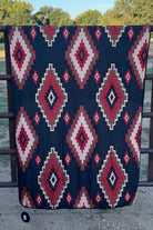 Wrap yourself in timeless western charm with the Homestead Holly Blanket. One side features a striking horse framed by a classic wreath, evoking vintage ranch style, while the reverse showcases a bold red and cream Aztec pattern for a vibrant contrast. Perfect for cozying up at home or adding a rustic touch to your décor, this versatile blanket combines comfort with authentic western heritage. Embrace the spirit of the West wherever you go with this unique and stylish layering piece.
