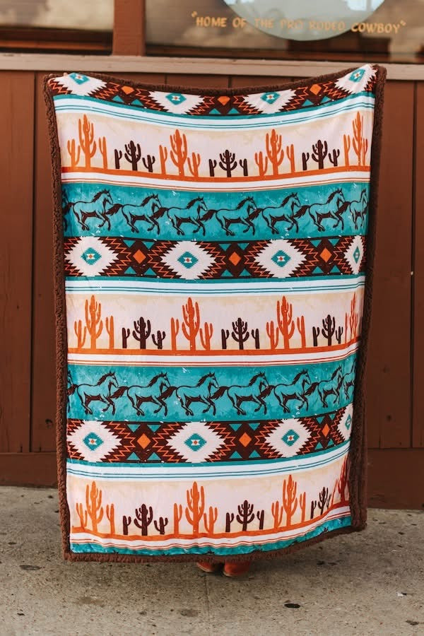 Multi Aztec Running Horse Printed Brown Sherpa Blanket - 54in x 72
