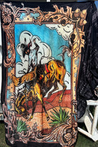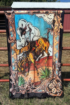 Wrap yourself in the rugged charm of the Roughstart Blanket, featuring vibrant Aztec patterns on one side and a striking bucking horse framed by expertly tooled leather on the other. This versatile blanket blends bold Western spirit with cultural artistry, making it perfect for cozy nights or stylish decor. Durable and visually captivating, it offers both warmth and a statement piece that celebrates tradition and adventure.