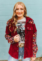 This piece features a deep wine red corduroy body paired with vibrant Aztec-patterned sleeves and yoke, complete with little cowboy silhouettes that give it a true cowgirl kick. đź¤