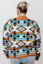 Get your cozy on in our Desert Vibes Geometric Striped Sweater. Made from a midweight warm sweater knit, this top features a banded ribbed neckline and cuffs for added comfort. The unique geometric striped pattern will add a touch of funky style to your wardrobe. Sweater weather never looked so good.