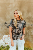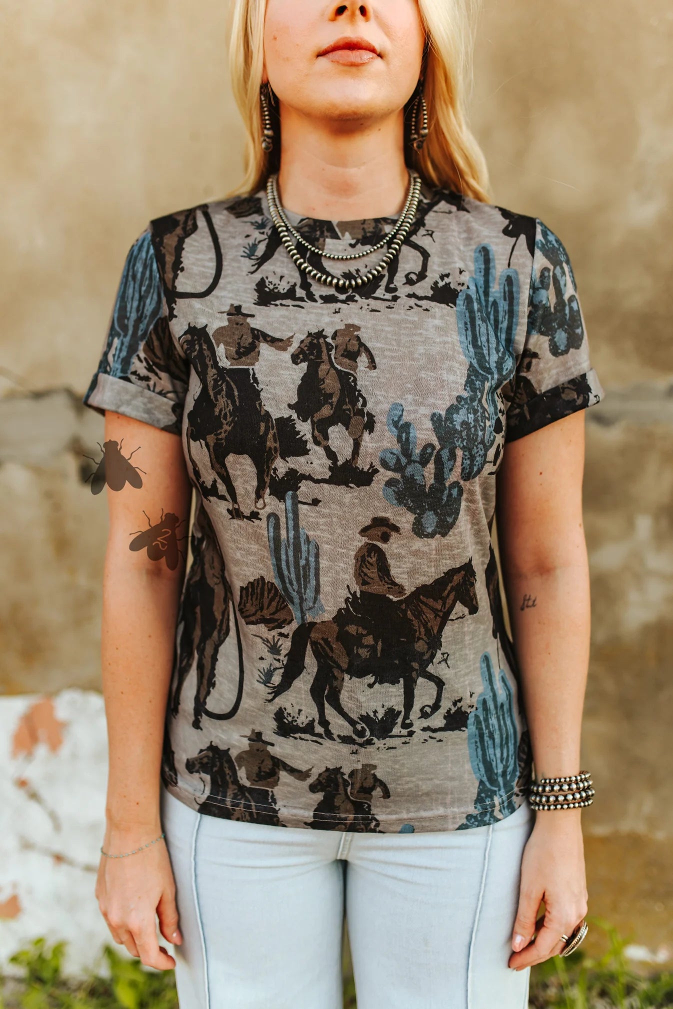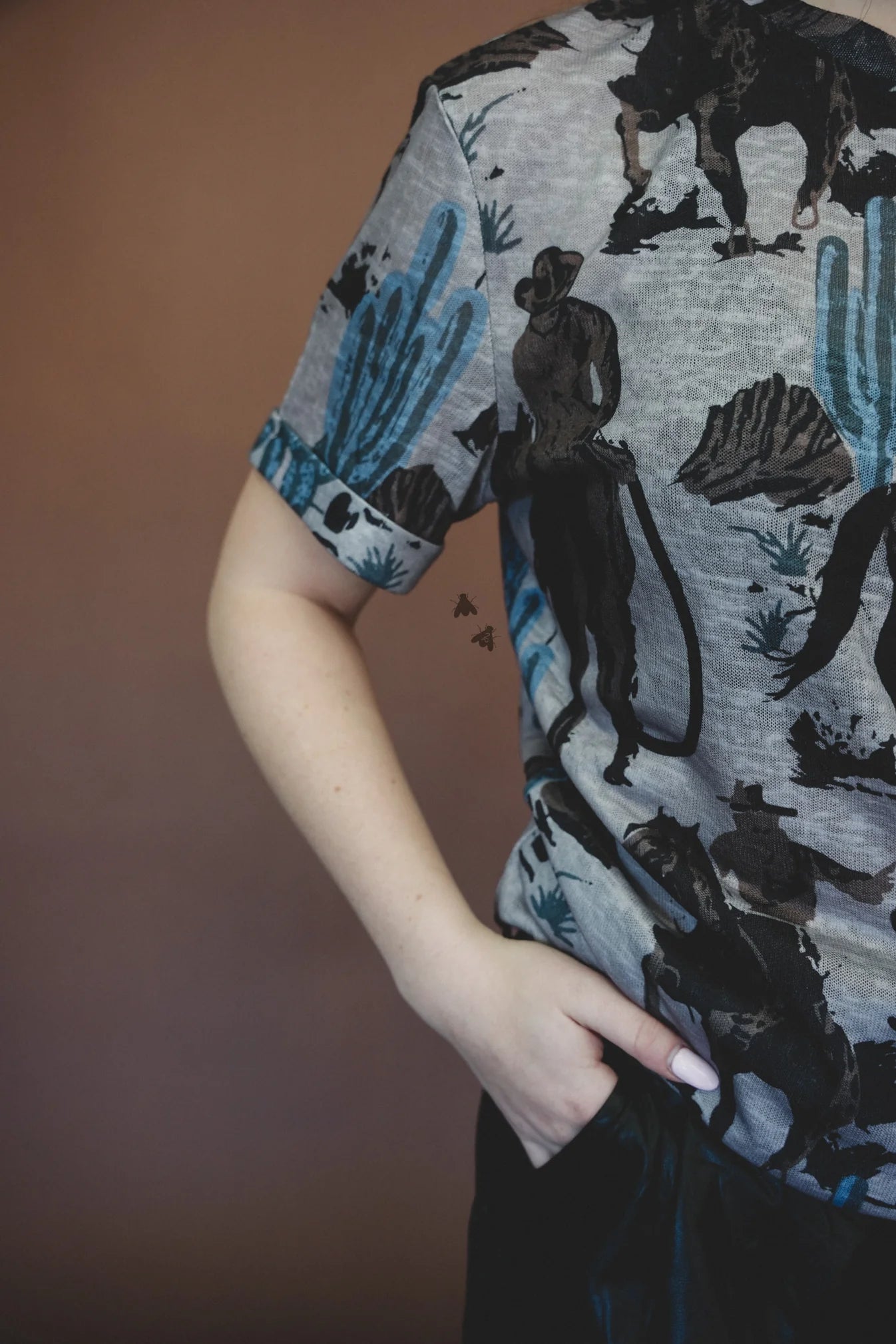Saddle up in this adorable western top featuring a charming desert landscape with iconic cacti. Perfect for anyone who loves cowboy vibes with a whimsical twist, this playful piece captures that free-spirited southwestern spirit. Whether you're heading to a rodeo, country concert, or just want to add some fun flair to your everyday style, this top lets you "dust it off" and embrace your inner cowgirl. Comfortable, cute, and unapologetically country.
