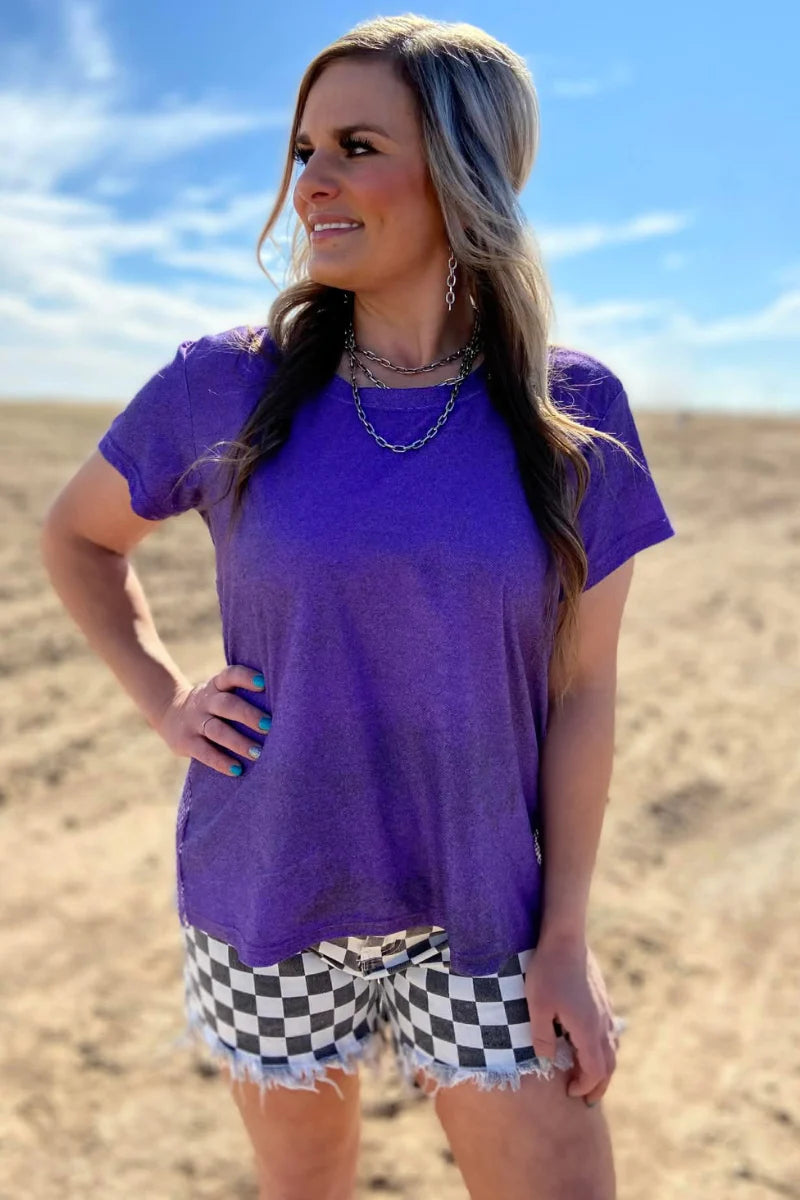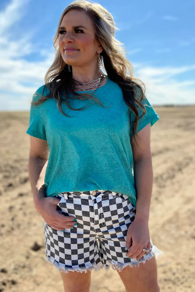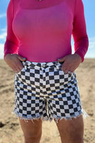 Classic black and white checkered denim shorts with a vintage-inspired wash. The timeless check pattern pairs effortlessly with any top, while the distressed detailing adds character and edge. Designed with an eye-catching asymmetrical hemline that's 2.5" longer in the back than the front. Perfect for casual days, festival season, or laid-back weekends. Comfortable fit with authentic denim construction.