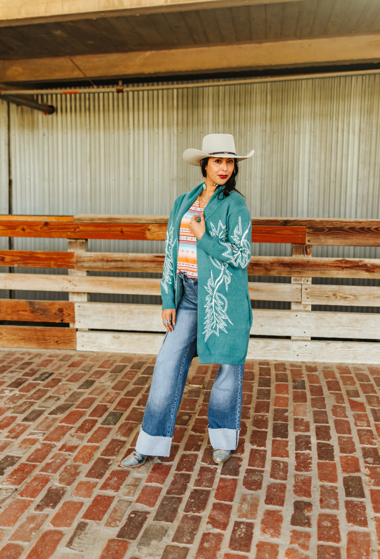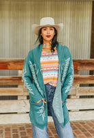 Wrap yourself in Western charm with our Jade Boot Stitch Cardigan. This cozy open-front knit features bold white boot-stitch embroidery along the sleeves and sides, giving it that perfect cowgirl flair. The rich jade color makes it a standout piece while still pairing easily with your favorite denim, tees, or dresses.