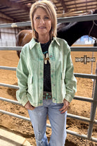The Lawless Jacket is western attitude wrapped in the perfect statement layer. The front features soft mint corduroy with subtle washed detailing, snap buttons, and roomy pockets—giving you that laid-back, lived-in look right from the first wear. Turn around, and it’s a whole moment: a cream back panel showcasing a buckin’ bronc illustration surrounded by bold black stars and a turquoise Aztec border.
