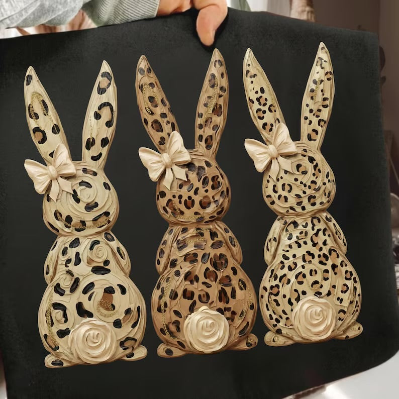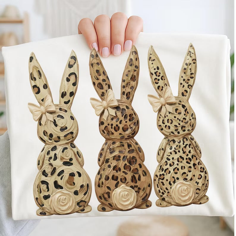Add a little sass to your Easter style with this adorable leopard bunny graphic top! Featuring three trendy Easter bunnies with chic leopard print patterns and sweet bow details, this design blends festive spring vibes with a bold boutique look.