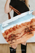 Oversized Western Ranch Scene Tote Bag, a functional yet stylish accessory every cowgirl will adore. This spacious tote features a stunning panoramic ranch illustration with cowboys on horseback, warm desert tones, and rugged mountain silhouettes. The durable canvas body is complemented by branded “Lucky & Blessed” straps, adding a touch of boutique identity and quality craftsmanship. Perfect for rodeo weekends, travel, shopping trips, or daily use, this tote is lightweight but large enough to carry essentials, outfits, or even work items