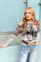 Turn heads this fall with our Light Grey Aztec Kicking Horse Printed Long Sleeve Top, crafted for the bold Western spirit. This playful piece showcases a soft grey base adorned with a striking graphic of a kicking horse, surrounded by vibrant Southwestern tribal designs in turquoise, red, black, and cream. The eye-catching pattern flows down both sleeves for a full Western vibe. Made from soft, stretchy knit fabric, it’s perfect for layering under denim jackets or pairing with your fave high-rise jeans and statement belts.